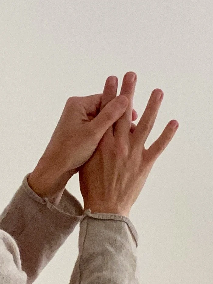 Mudra 4: halte dir die Rückseite von Daumen, Zeigefinger und Mittelfinger gleichzeitig (siehe Foto)
