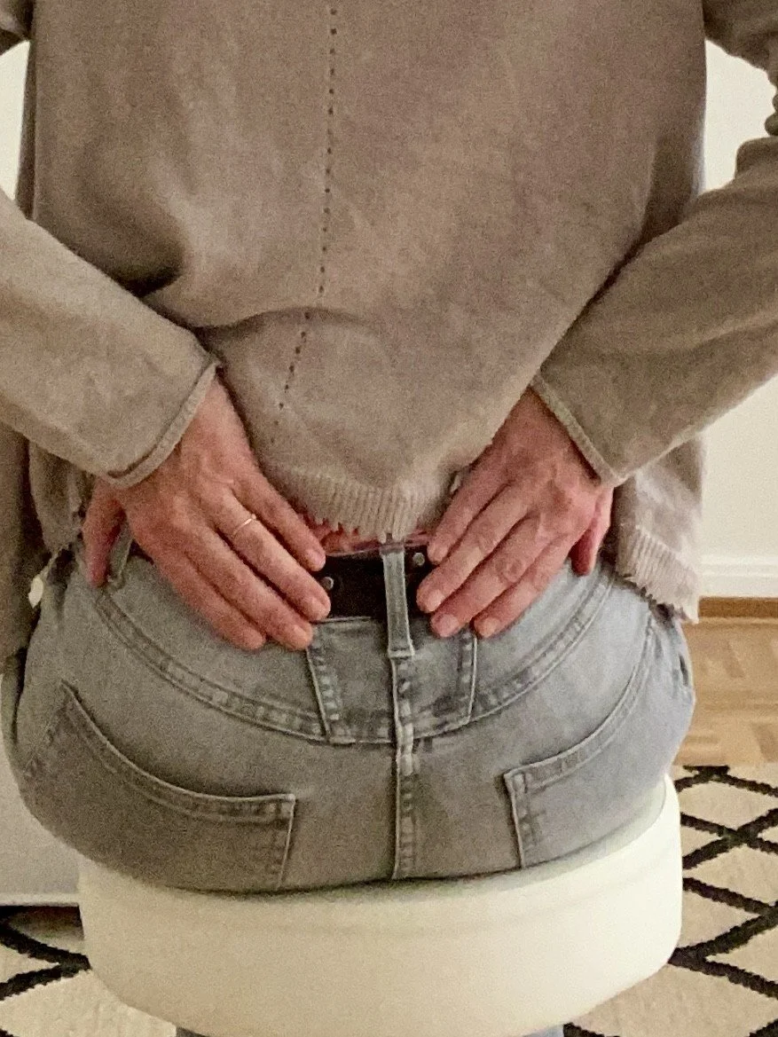 beide SES 2 gleichzeitig strömen (großes Foto): die Hände liegen am Hüftknochen (du kannst auch nur das rechte oder das linke SES 2 mit einer Hand halten)