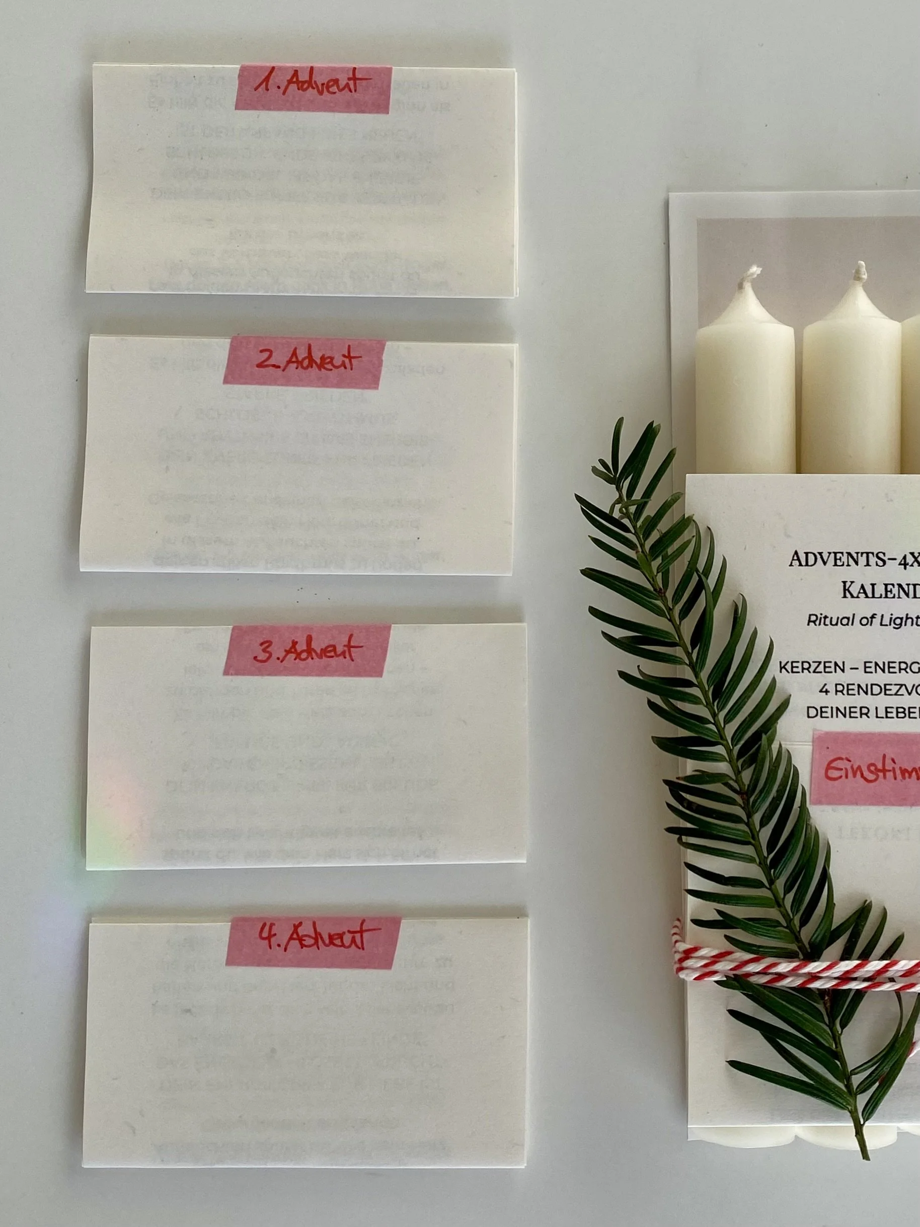 Jede Kerze steht für eine besondere Qualität des jeweiligen Adventssonntags – und jedes Ritual führt dich einen Schritt tiefer zu dir selbst. Was dich im Inneren der kleinen Päckchen erwartet, bleibt eine Überraschung. Nur so viel: Du erhältst eine stimmige Symbolik, eine kurze Anleitung und einen leicht anwendbaren Energiegriff für deinen Moment mit dir.