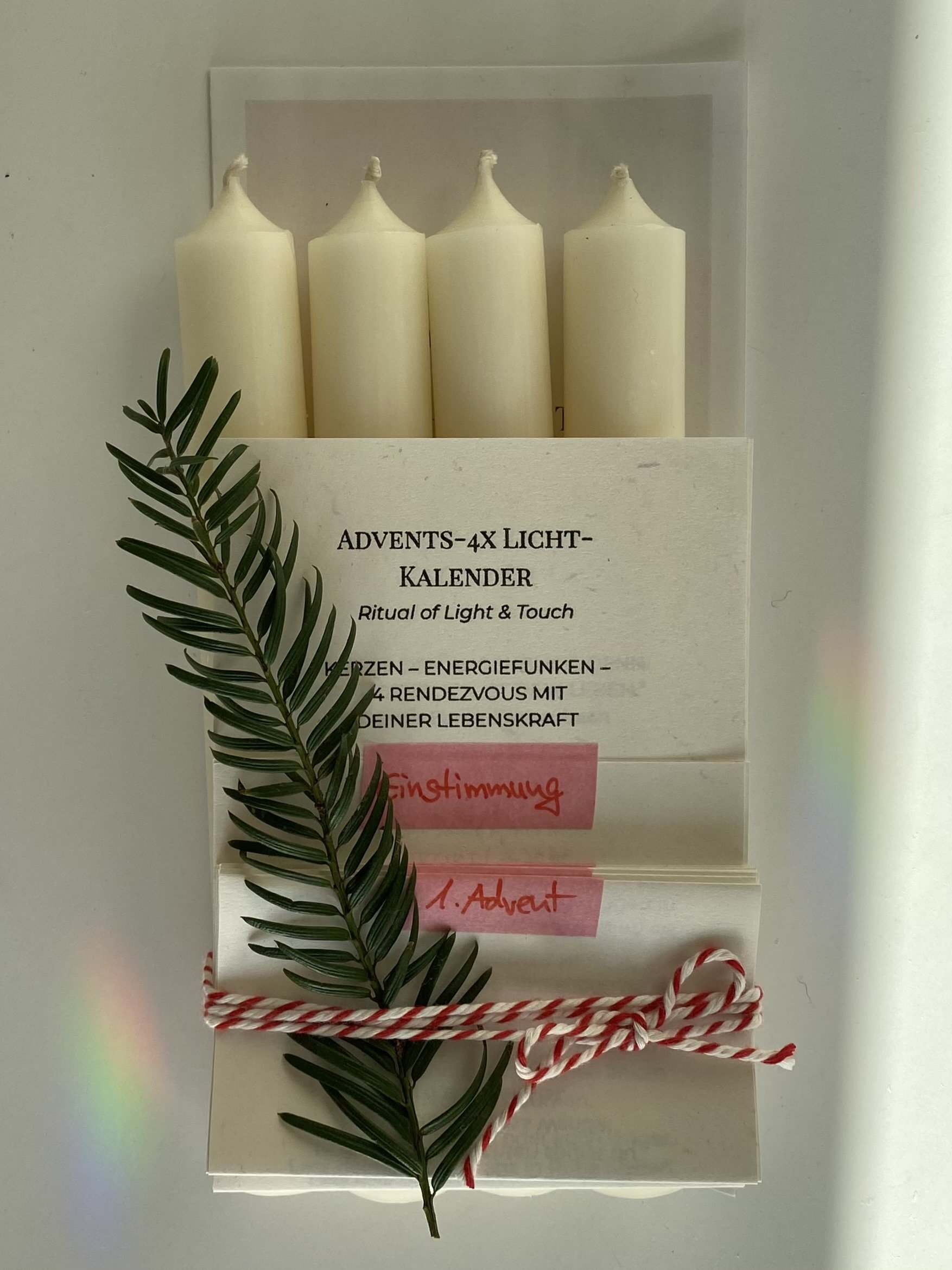 Vier Kerzen, vier kleine Rituale, vier Momente, in denen du dein eigenes Licht wieder spürst. Der Advents-4x Licht-Kalender begleitet dich an jedem Adventssonntag mit einem feinen Zusammenspiel aus Kerzenlicht, Atem und einer sanften Berührung aus dem Jin Shin Jyutsu.